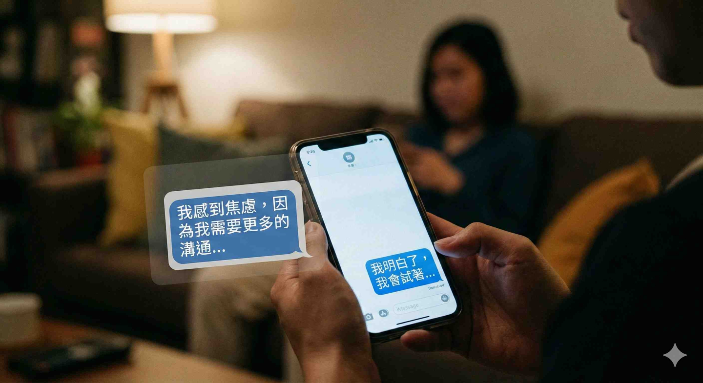 要扭轉這種針鋒相對的對立溝通模式,必須採用被專業心理治療界與關係修復專家廣泛推崇的「以我為主語(I-Statement)」表達法。這種技巧的核心運作邏輯在於:徹底停止描述「對方做了什麼錯事」(放下指責),轉而專注陳述「自己感受到了什麼真實情緒」(展現脆弱)。